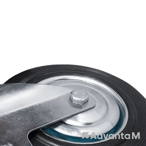 Колесо поворотное с тормозом серии SCb имеет обод из оцинкованной стали и шинку из литой чёрной резины. В ступице установлен надёжный роликовый подшипник. Диаметр колеса 160 мм. Обод шириной 36 мм устойчиво передвигается по опорной поверхности любого типа, не деформируется при большой статической нагрузке. Кронштейн для крепления с платформой размером 135x105 мм, расстояние между центрами отверстий в крепёжной площадке 105x75 мм. Максимальная грузоподъёмность 150 кг.